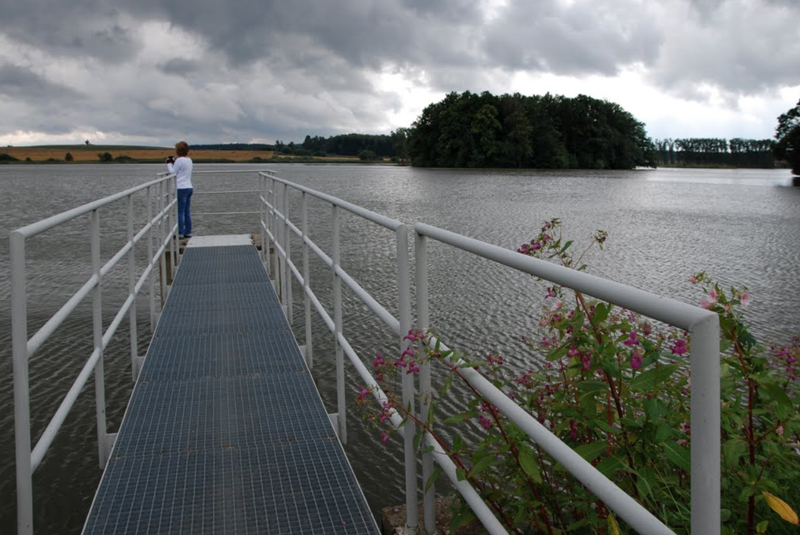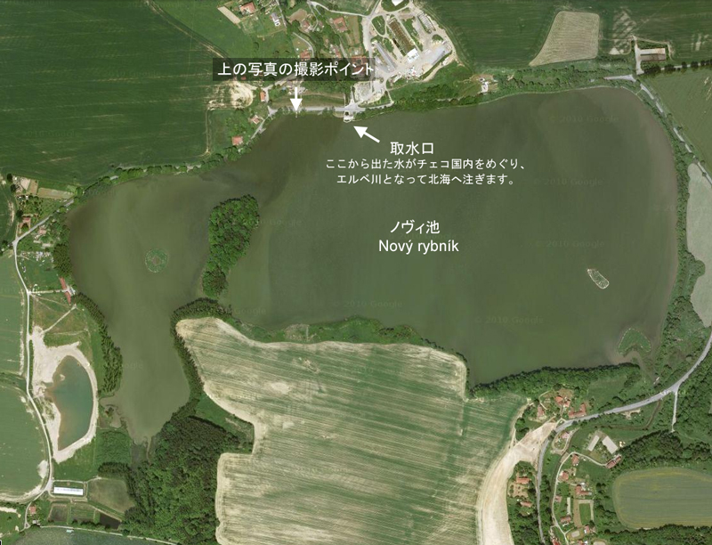 ノヴィ池を上から見るとこのようになっています。 この水がチェコ国内をめぐり、エルベ川となってドイツを北上し、北海に注ぎます。 女性が立つ桟橋は取水口の横にあります。 写真をクリックすると桟橋部分の拡大写真が見えます。