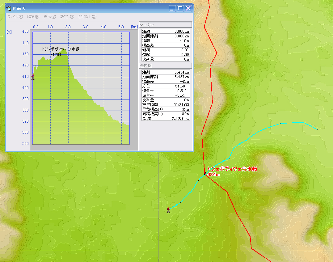 さらに拡大します。 峠になっていることが断面図を見ると分かります。 典型的な片峠です。 左側の平らな土地の水は分水嶺の峠を越えては流れることができません。