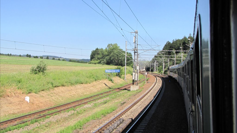 プラハ駅 (Praha hlavní nádraží) を 10:39 に出発したウィーン行きの特急列車 EC77 Antonín Dvořák は パルドビツェ 11:37、チェスカ・トジェボヴァ 12:17 に途中停車し、その直後の 12:20 にトジェボヴィチェ駅を通過します。 ウィーン新駅到着は 15:55。