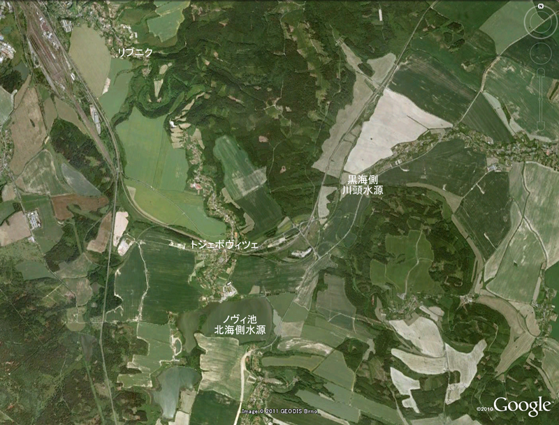 北海に注ぐエルベ川の支流のヴルタヴァ川 (ドイツ語ではモルダウ川) が流れるプラハからウィーンへ向かうヨーロッパ特急は東に進み、パルドビツェの町を過ぎて1時間ほどでヨーロッパ大分水嶺を越えて、黒海へ注ぐドナウ川の支流地域に入ります。 この部分は日本列島と異なり、山や丘といっても大変標高の低い平原のような景色です。 これだけ大きい分水嶺なのですが、旅人も住んでいる人もここが分水嶺であることを意識していないし、目で見ても分水嶺だと気が付きません。