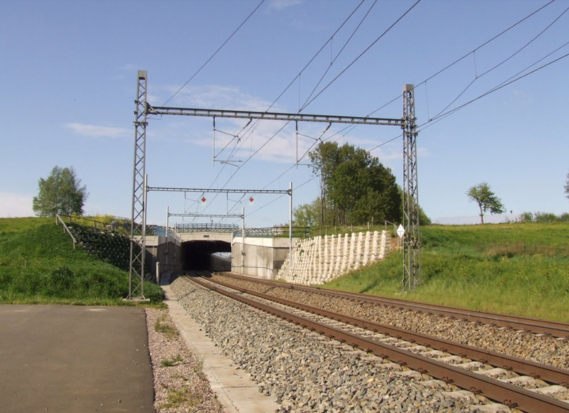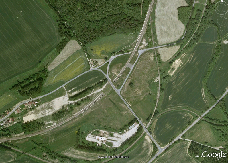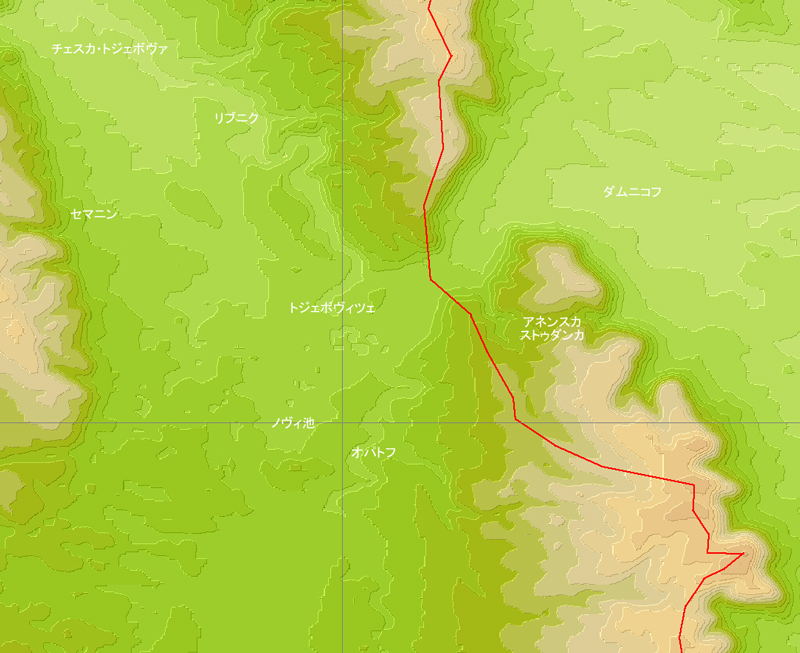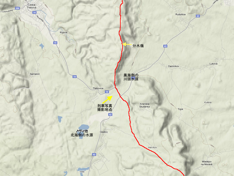 上の地図の右側、黒海側 から登ってきたプラハ方面行きの特急列車が分水嶺を越えたところです。 右にカーブしてまもなくトジェボヴィツェ駅を通過します。 こんな平らなところが分水嶺だと思えませんよね。 しかし前方の見える道路付近の峠の向こう側は上の断面図に示すように、急な上り坂になってここまで上ってきます。