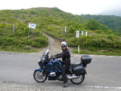 禿(かしら)岳の東側に広がる禿高原の鬼首ゴルフクラブの横を通過し町営牧場を横切る県道を登り詰めると広々とした花立峠である 県道であるために、宮城県(右側後方)と山形県(左側前方)の県境で道路の補修・整備状態が異なっている