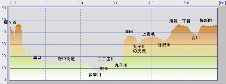 用賀から多摩川を跨いで溝口を結ぶ線の断面図です。 国分寺崖線の高さがよく分かります。 また多摩川の本来の河川敷がいかに広いかが分かります。 川の中に大勢の人々が住んでいるわけです。 山田太一のテレビドラマ 「岸辺のアルバム」を思い出します。