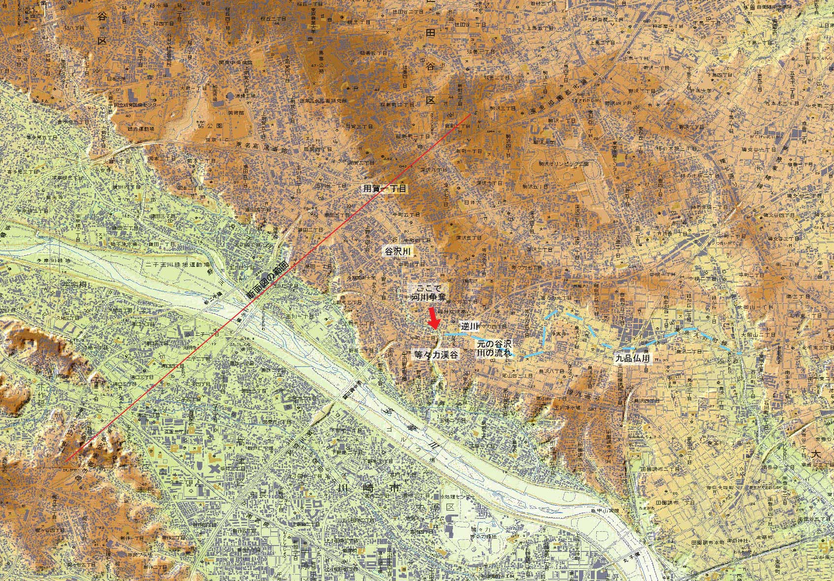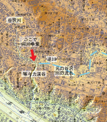 東京都世田谷区の用賀1丁目付近は見てすぐそれと分かる国分寺崖線 (ハケ) の上部です。 この崖の下を崖線に沿って谷沢川が流れて、下流に等々力渓谷をなしますが、この谷沢川はかつては東へ直進して九品仏川から呑川へ流れていました。 しかし現在の等々力駅付近で、等々力川 (勝手に名前をつけました) の谷頭浸食で流れが変わって現在のようになりました。 これを河川争奪といいます。 等々力川が勝った川、谷沢川が負けた川です。 現在、谷沢川は等々力渓谷の少し上流の等々力駅付近で「逆川」(暗渠で見えません) を合流していますが、ここでは、かつて河川争奪が起こる前は、谷沢川の水は東急大井町線が通る川筋にそって、逆に九品仏川に流れていたのです。 等々力川の谷頭が谷沢川に達したときに九品仏川の上流部分が谷沢川側に流れを変え逆行し、それで「逆川」と呼ばれているのです。 このときに、谷沢川の流れを受けた等々力川は水の勢いが強くなってさらに侵食が進み等々力渓谷の深い谷ができたのです。 なお、現在の谷沢川は等々力渓谷の下流で六郷用水と直角に交差しますが、ここは人工の造作で江戸時代以降何度か変更されているので、土木工学に関心ある人にはみどころかもしれません。