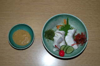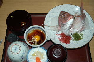 鯛の刺身を卵と醤油味のだしにつけて、温かいご飯の上に乗せて食べる漁師料理