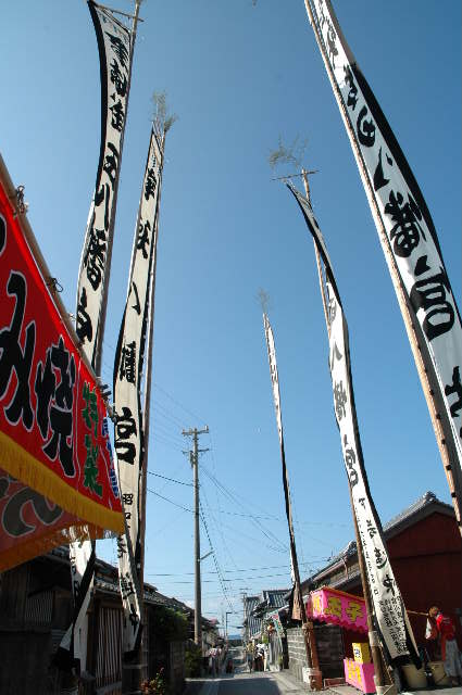 吉良町 昔のしっくいの蔵が残る町並み。おりしも祭の日