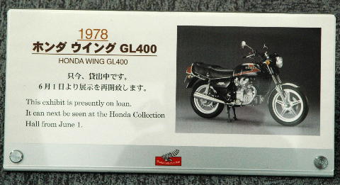 ここのホンダウィングGL400を見るのが目的で立ち寄ったがあいにくこのオートバイだけが貸し出し中で展示されていなかった。