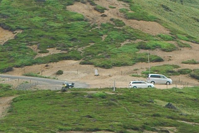 分水嶺上のハイキング道から東側に目を向けて峠を見下ろす。我々のバイク2台と2台の自動車が駐車している(下の拡大写真参照)手前の土道をはさんで横たわる二つの岩の間あたりが峠ポイント。分水嶺を越えている鉄塔はかつての硫黄鉱山の運搬用ロープウェー設備の残骸。硫黄鉱山は右方群馬県側を少し下ったところにあった。 |
