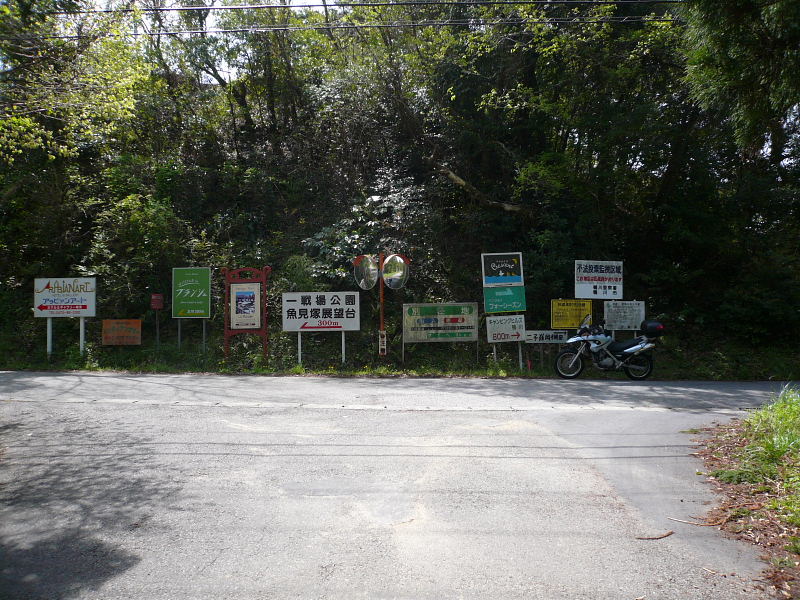 林道と公道の交わる三叉路に立ち並ぶ看板群