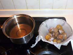 グラニュー糖は転化糖を含む上白糖より純度が高く、ショ糖成分が約 99.5% ですので同じと考えて差し支えありません (化学的には不純物が溶解度を大きく変化させることがありますが、今回は料理なのでそんなに厳密でなくてもいいでしょう)。 しかし、予定したよりどうも砂糖を多く必要とするようなので、毎日追加するグラニュー糖の1回あたりの量をもう少し増やしてもいいかもしれません。 ただ、煮ている間に水分がかなり蒸発するので、この数字よりは少ないグラニュー糖で飽和すると考えられます。 化学屋のマロングラッセ作りです。
