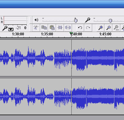 この波形を表示するには、NHKのFM放送を ONKYO の CD/MD TUNER AMPILIFIER, FR-N9FX で USBメモリーに録音します。 このときは MP3フォーマットです。 そのファイルをフリー音楽編集ファイル Audacity で呼び込むと、ステレオの左と右の音の波形がこのように見えます。 この形にしておけば、切ったり、貼ったり、伸ばしたり、ピッチを変えたり、音量を変えたり、いろいろな編集ができます。 このソフトには重宝しています。