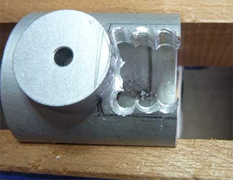 それをヤスリで整形しました。 下から見えている丸い筒はヤスリで削っているときに出る金属粉を吸い取るための掃除機の吸い込み口です。