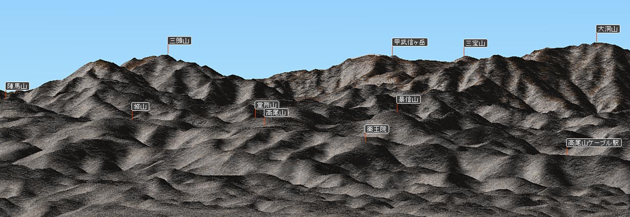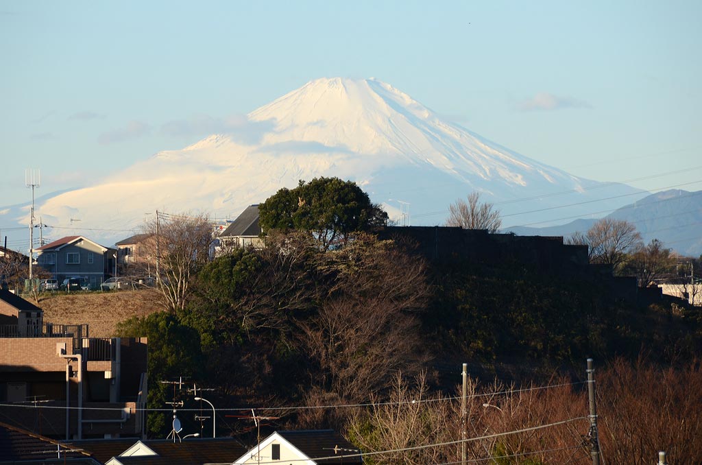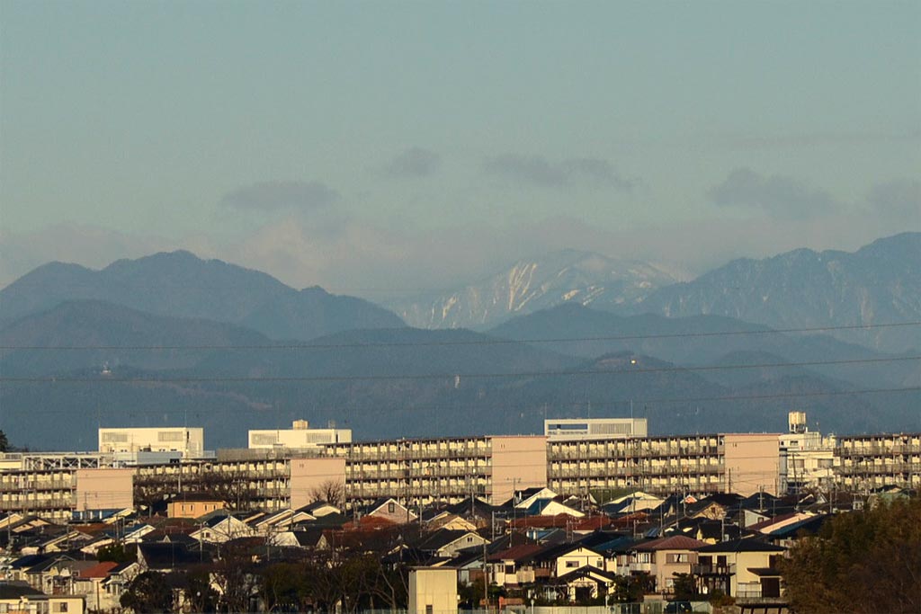 北西方向 (303度) の山々です。 甲武信ヶ岳は雲に隠れて見えません。 アパート群は保土ヶ谷区の新桜ヶ丘団地です。 左から 7, 10, 11, 14, 15号棟です。