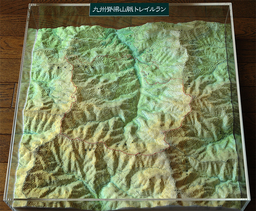 立体地図 Relief map 先日、国土地理院の元幹部を務めた方と知り合いになりました。 この方は測量と地図に関する行政のプロのみならず、一方ではまた「地図学の権威者」でもあります。 そこで、私が以前に作成した「九州脊梁山脈トレイルラン」と名付けた立体地図を見てもらいたくてその写真をメールで送付しました。