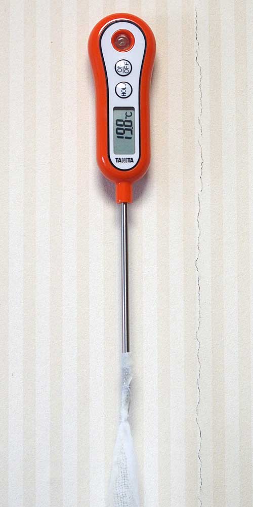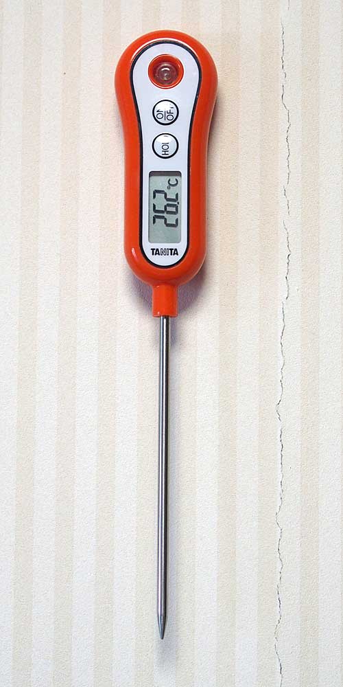 簡易乾湿法 Easy Psychrometer 乾湿法による湿度測定、つまりアウグスト氏による方法は測温部が露出している一つの温度計があれば可能です。 これは料理用のタニタの温度計です。 測温体は針の中に埋め込まれた熱電対です。 そのまま計れば乾球温度、先端にガーゼのウィックを付けて水を含ませてしばらくすると湿球温度が指示されます。 指示される温度はきのう入手した精密温度計の示度よりも約 0.7℃ から 0.8℃ 高めですが、その誤差にかかわらずこの二つの温度示度からかなり正確な湿度が求められます。 (なお、この温度計を沸騰する100.0℃の水の中と氷と水を混ぜた 0.0℃ の中で測定するとわずか 0.1℃ から 0.2℃ の差で、これは測定誤差を勘案するとかなり正確です。)