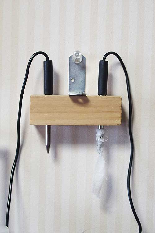 プローブを固定するのに材木に穴をあけて差し込み、それを他の乾湿計の測温部とほぼ同じ高さになるように壁に固定しました。
