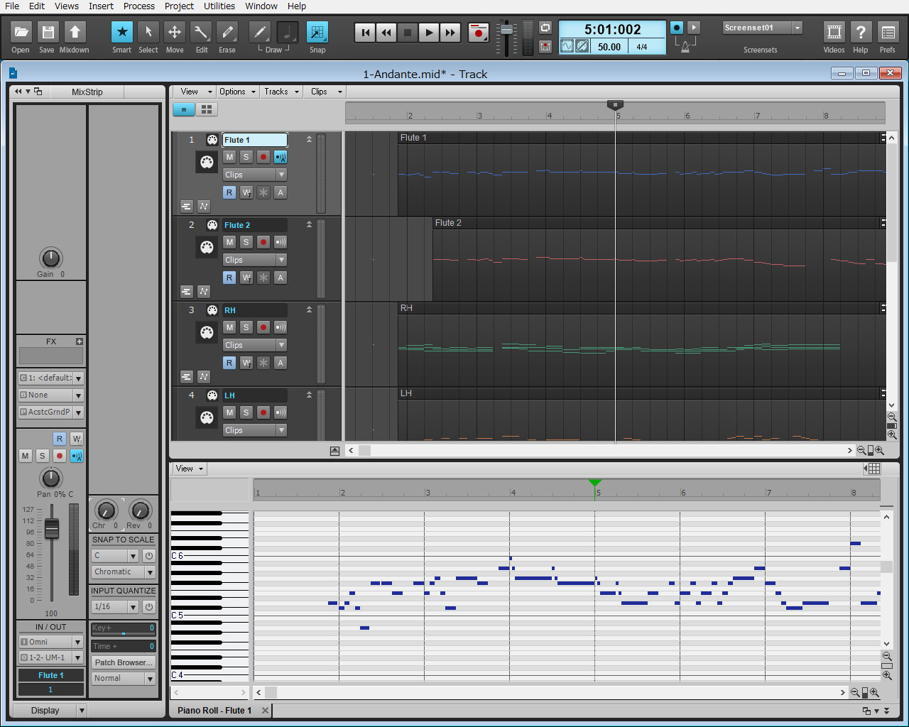 シーケンサー Sequencer software フルートアンサンブル練習の課題曲は ゲオルク・フィーリプ・テーレマン (Georg Philipp Telemann 1981-1767) の Tafelmusik 第3巻の Trio D-dur (2本のフルートと通奏低音) TWV42:D5 です。 使用楽譜は Amadeus の通販で入手した Camera Flauto Amadeus シリーズ No.9 (BP369) です。 効率の良い練習のためにいつもの通り楽譜を シーケンサーで「打ち込んで」MIDI ファイルを作成しました。