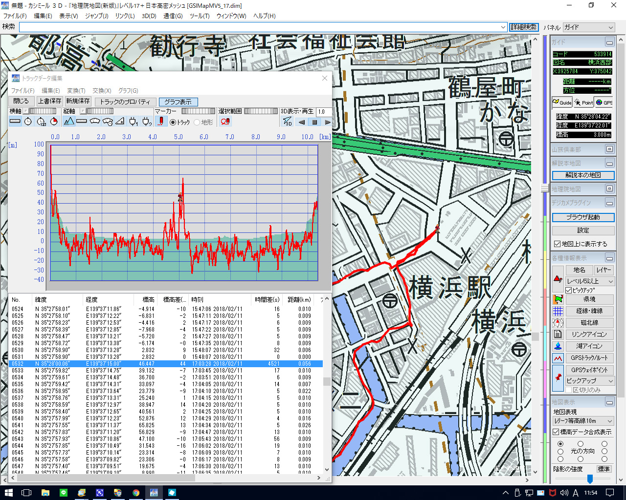 GPS信号受信が落ち着いてからアプリを起動してみたが改善は見られない。 標高の表示が相当に乱れている。 下の画像は横浜駅西口の高島屋横からシェラトンホテル前の地下街入口の地点である。 GPSデータの詳細を見る。 No.531