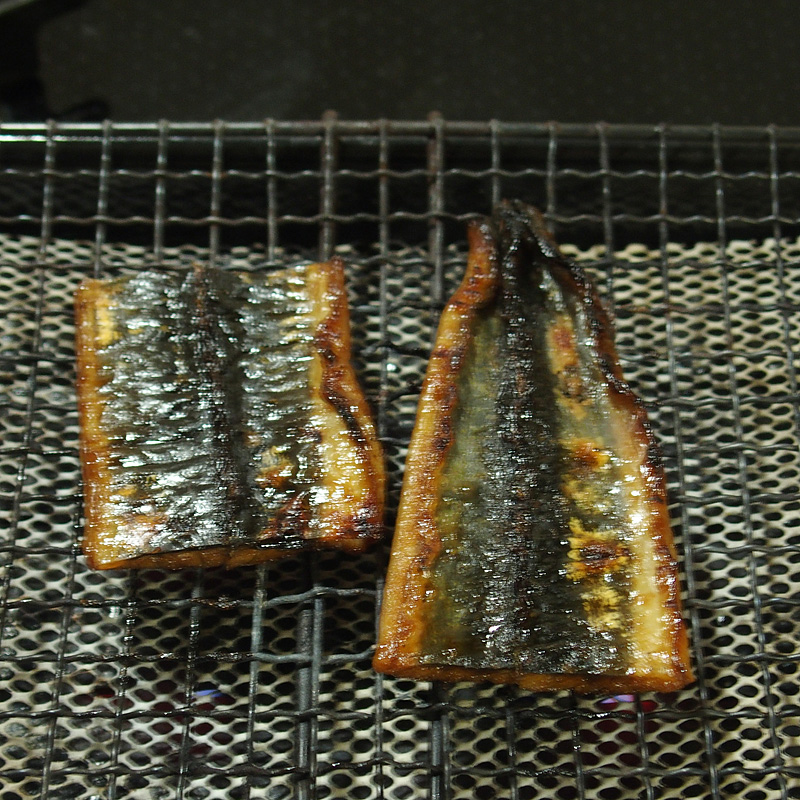 裏返して身の方を3分焼く。 タレを刷毛で塗り、裏表を少しあぶる。