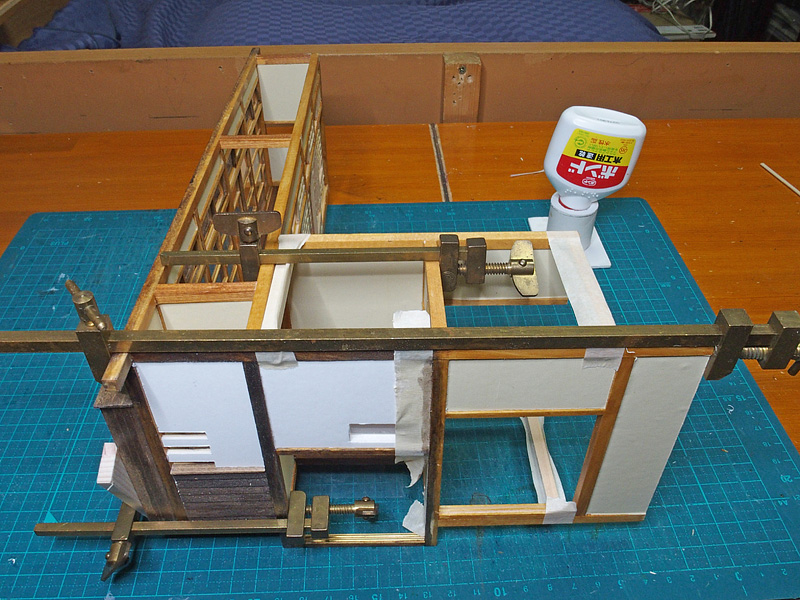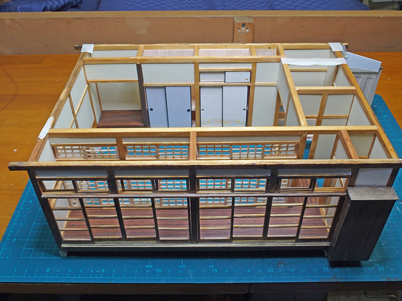 玄関ブロックに含まれるトイレの壁と便器の取り付けが終わってこのブロックは完成である。 南側の廊下ブロックと合体させる。 すべてのパーツをきっちり寸法通りに製作したので合わせてもぴったり。