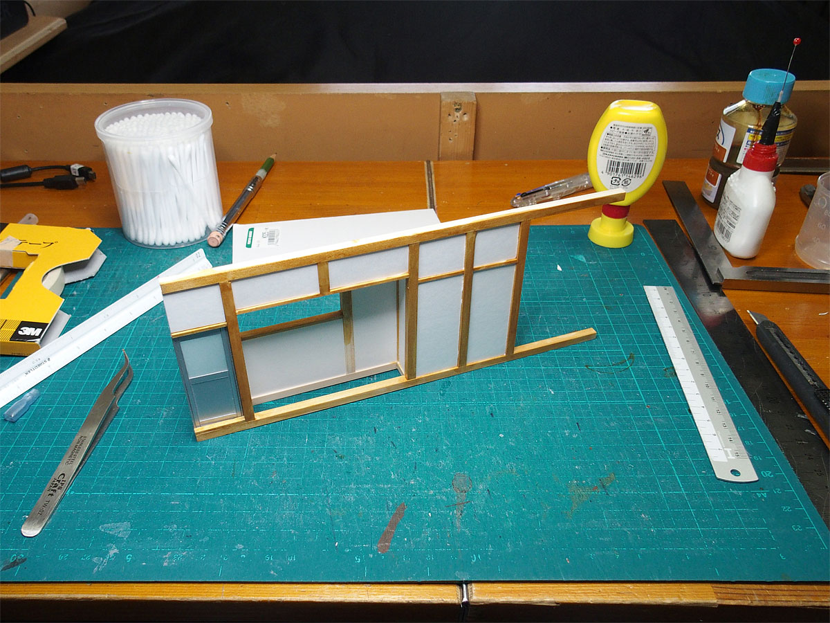 少し張り出しているキッチンの外壁を作っている作業の様子である。 マットの表面が擦り切れて5mm方眼の升目が読み取りづらくなってきた。 替え時かもしれない。