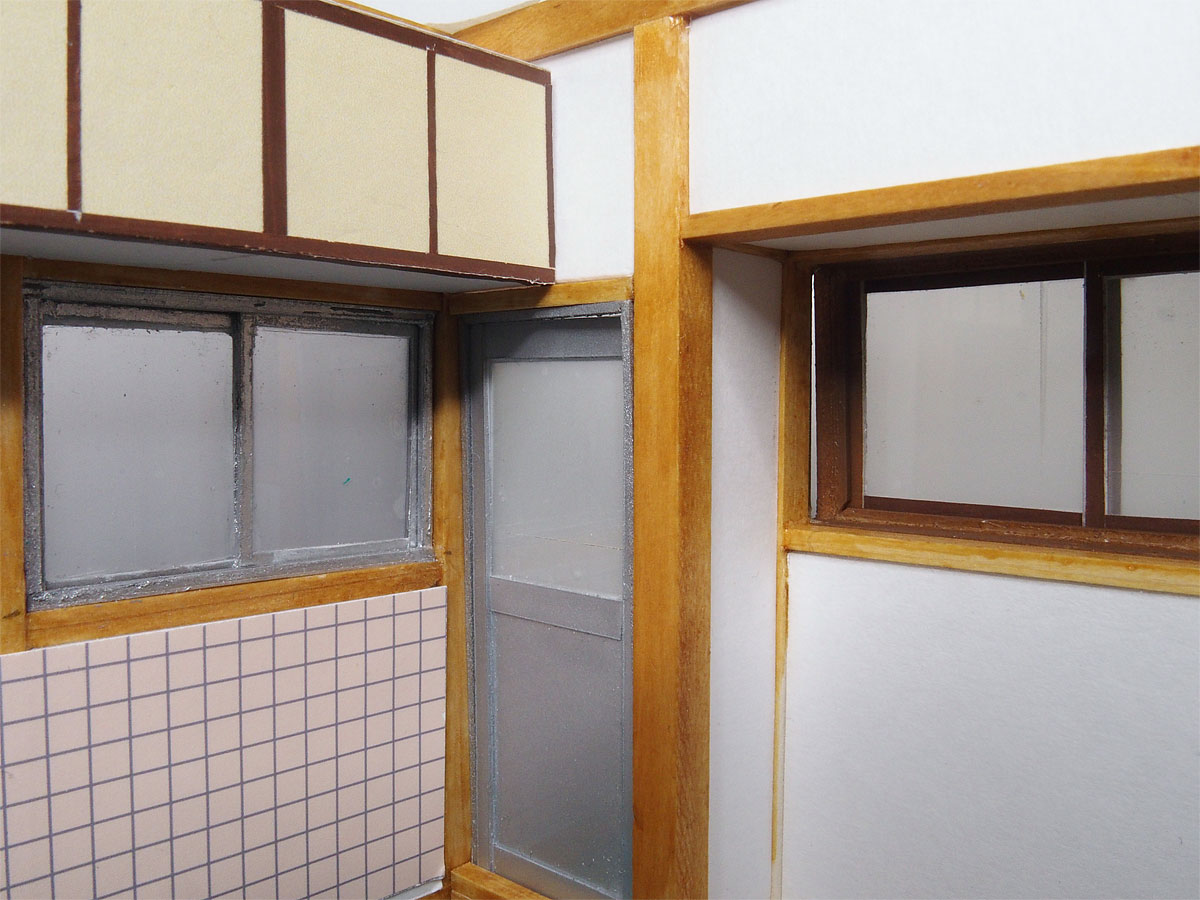 この外壁の出窓はブロンズのアルミサッシである。 おそらく改築した時に付け替えたものと思われる。 北側の壁の窓の下の壁は10cm角のタイル張り。 ここに洗濯機を置いていた。 どうやらこの家を設計した義兄が洗濯機置き場を風呂場・洗面所近くに設けることを失念していたようだ。 タイル光沢感を出すために写真用紙の光沢紙を壁の下地に貼ったらそれらしくなった。 タイルの数と位置も本物と同じ。 タイル壁の足元に隙間が見えるが床の高さが土台の上端から