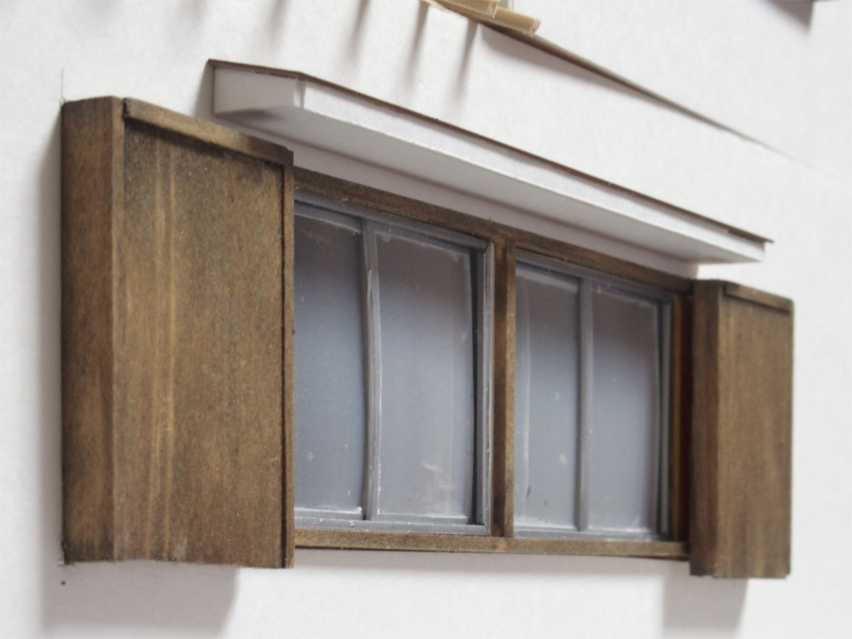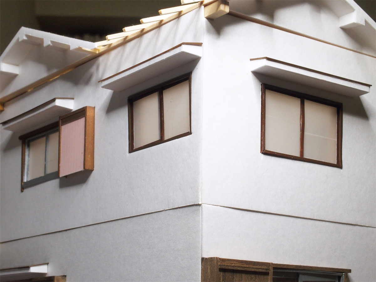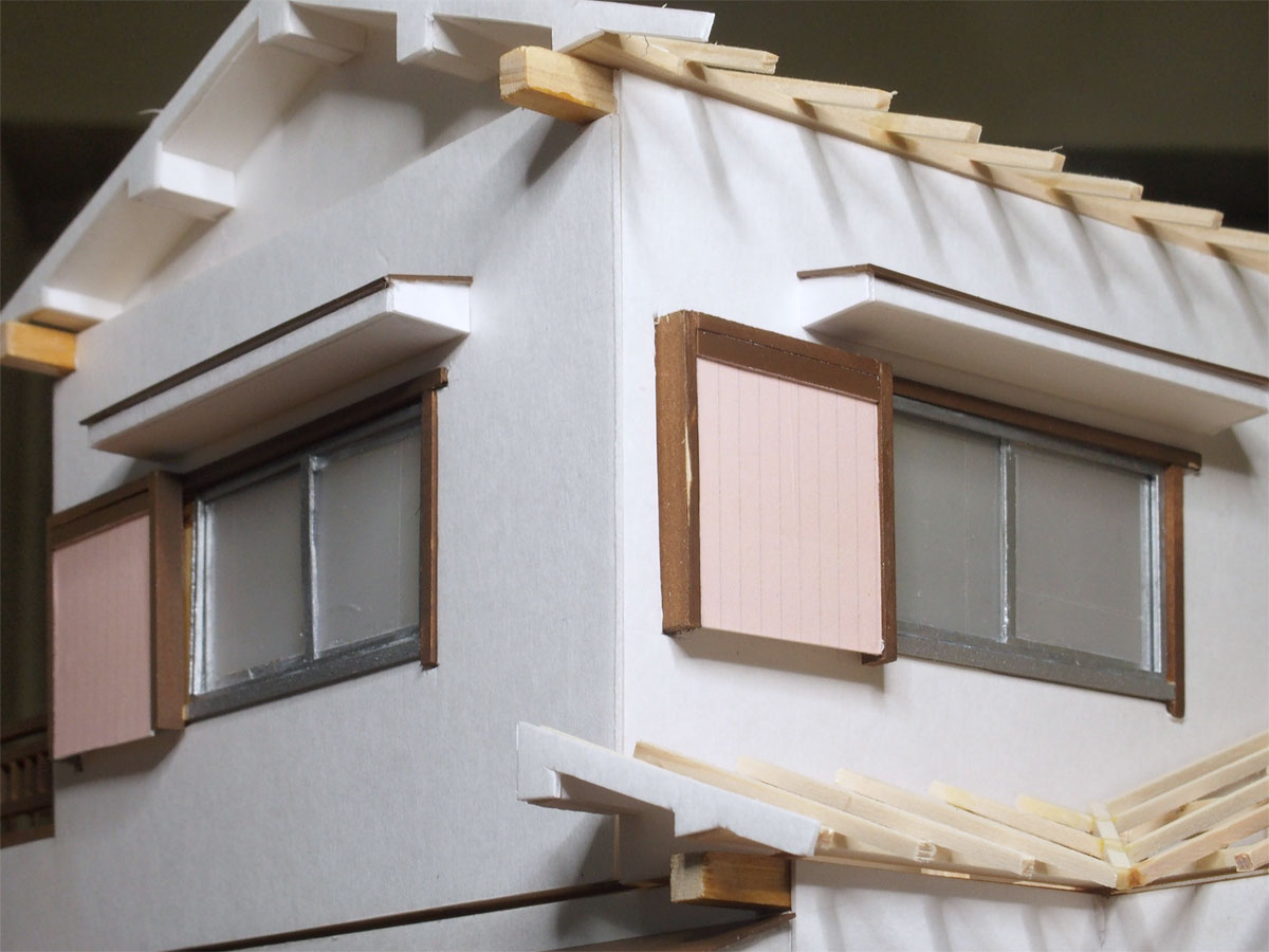 2階南西側の窓の庇。 手前の増築部分の部屋の窓の転落防止策と雨戸は未完。