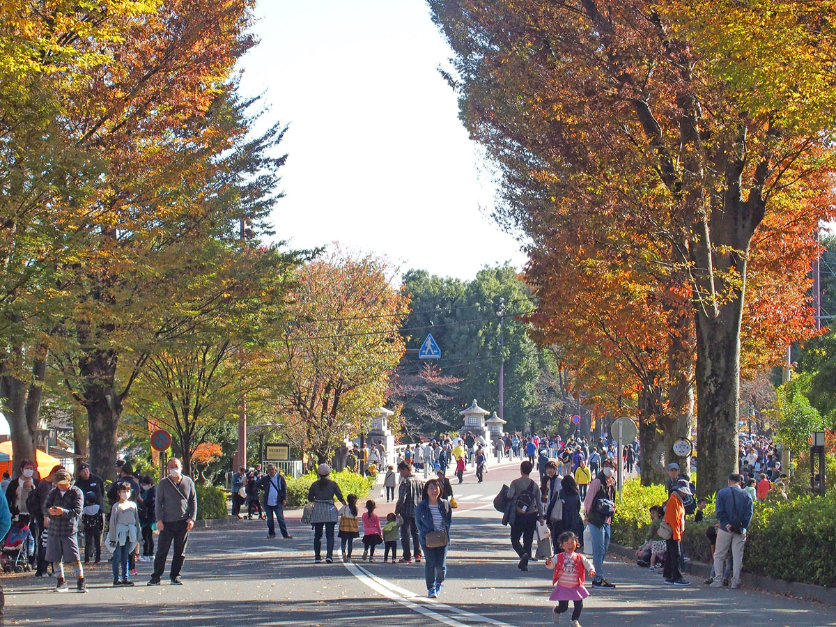 沿いで「いちょう祭り」が繰り広げられている。 高尾山に近い南浅川橋付近から武蔵陵墓地に至る多摩御陵参道で孫が通う幼稚園児の鼓笛隊がパレードするというので見に行った。 イチョウ並木が美しく色づいた甲州街道を西八王子駅から御陵前交差点まで歩いたが、道路の両側には数多くの露店や古物市などが立ち賑わっている。