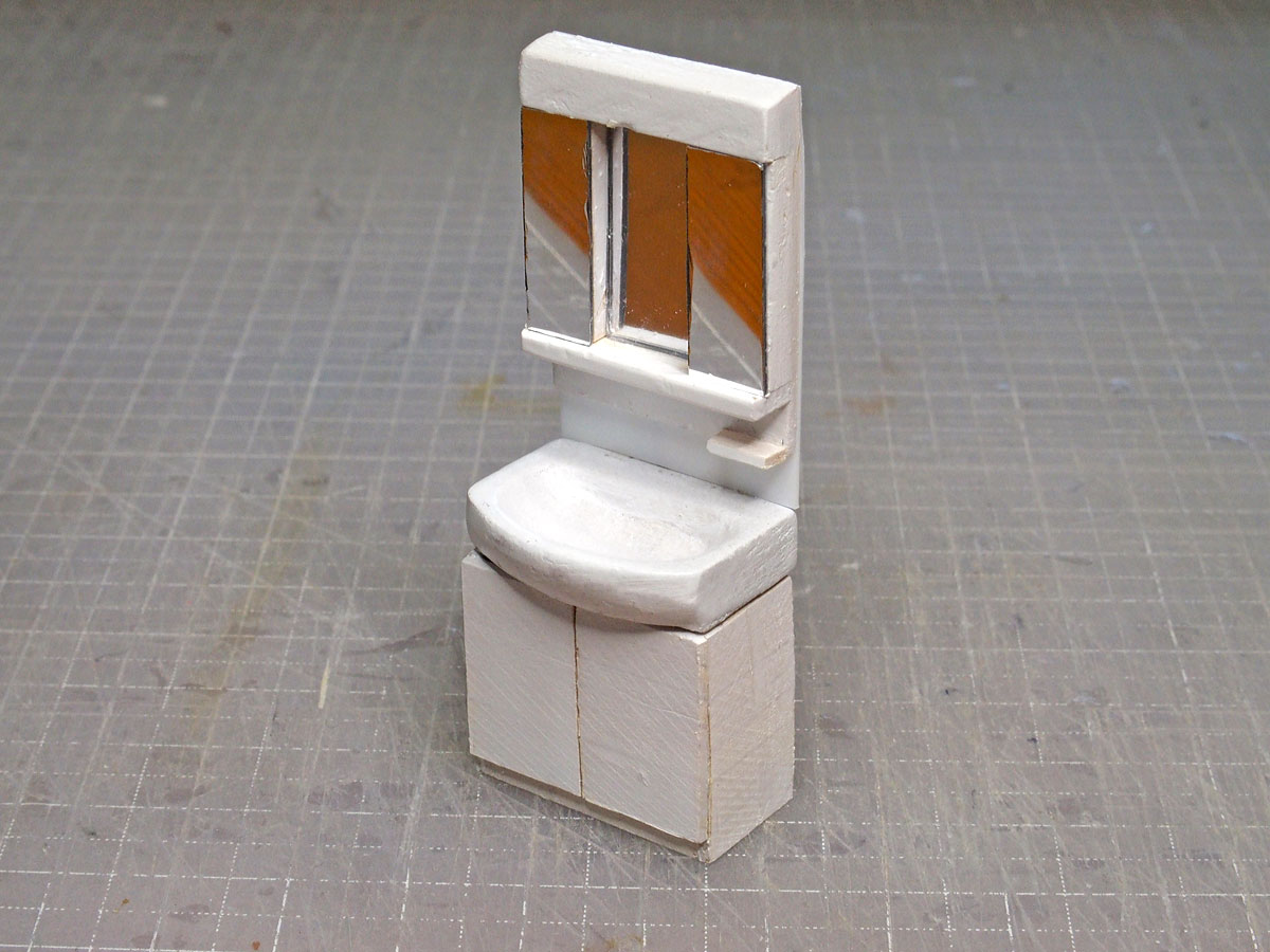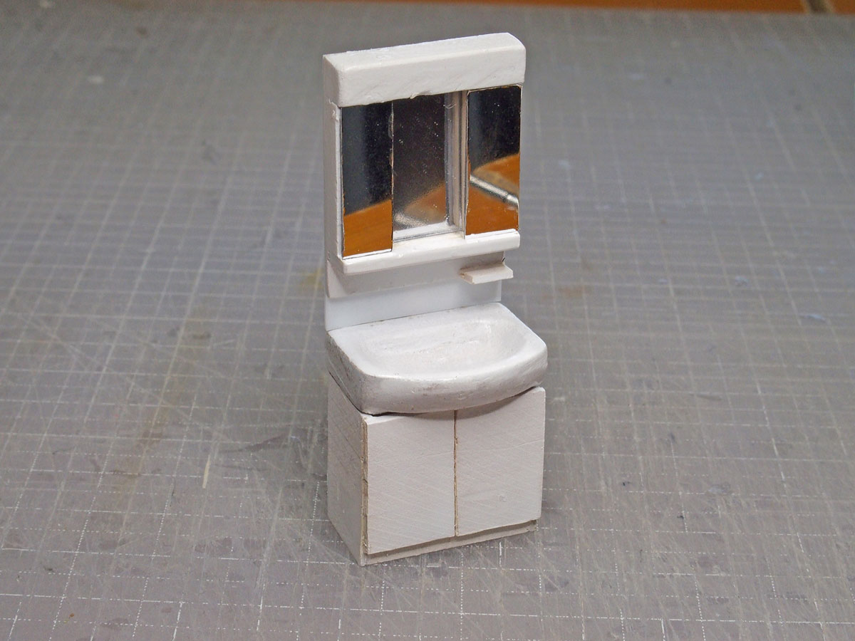 洗面台の上部キャビネットに鏡を入れ、下キャビネットの扉をさらにそれらしく作り直した。