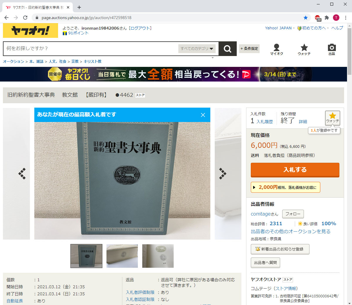 読書の助けになるように「旧約新約聖書大事典」をヤフオクで落札した。 教文館発行、1989年初版、1995年に第2版、2001年に第3版が発売されたが、この落札した書籍の版は分からない。 定価49,500円。 実は、2時間前にこの本の別の出品に最初は入札額 5,000円で参加して競い、最終的に 16,000円まで値を上げたが、結局 16,500円で負けて落札できなかった。 負けて良かった。
