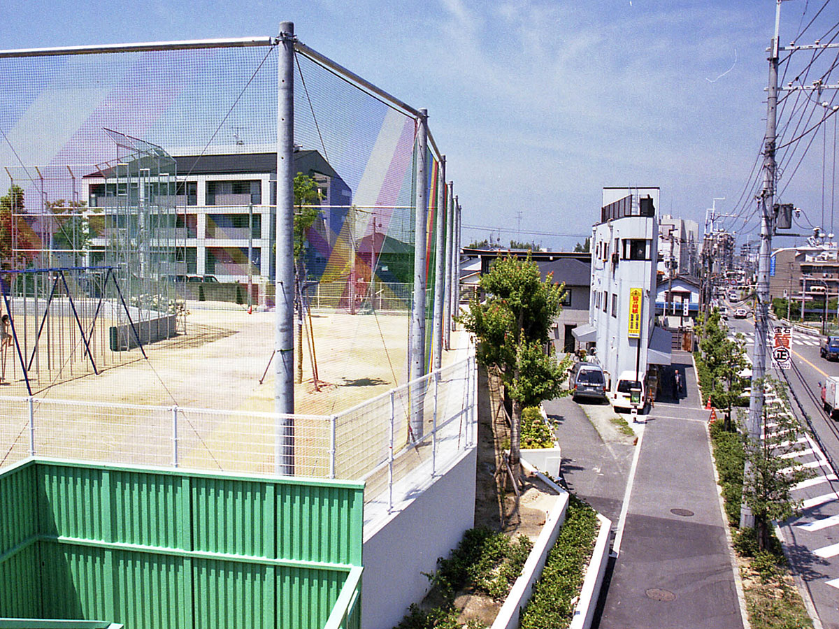 歩道橋から西を見る。 ここは昔は一段下がっており、私たちが5年生の時にできたプールがあった場所である。 学校と伊丹街道の間に「河合事務用品店」の建物が見える。 昔から敷地が限られていたのでとても細い建物である。