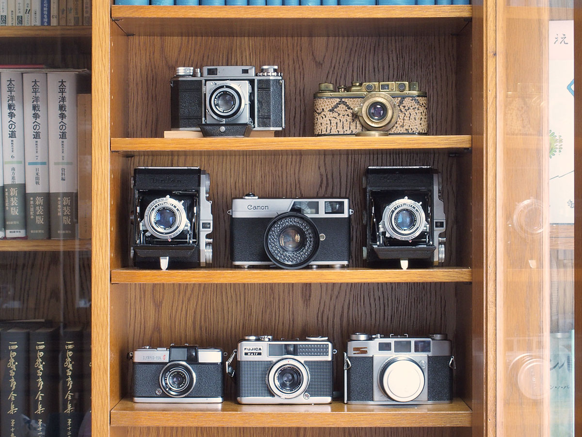 書棚に飾ってあるのは譲り受けたり、昔使っていたカメラの現物やヤフオクで購入したもの。