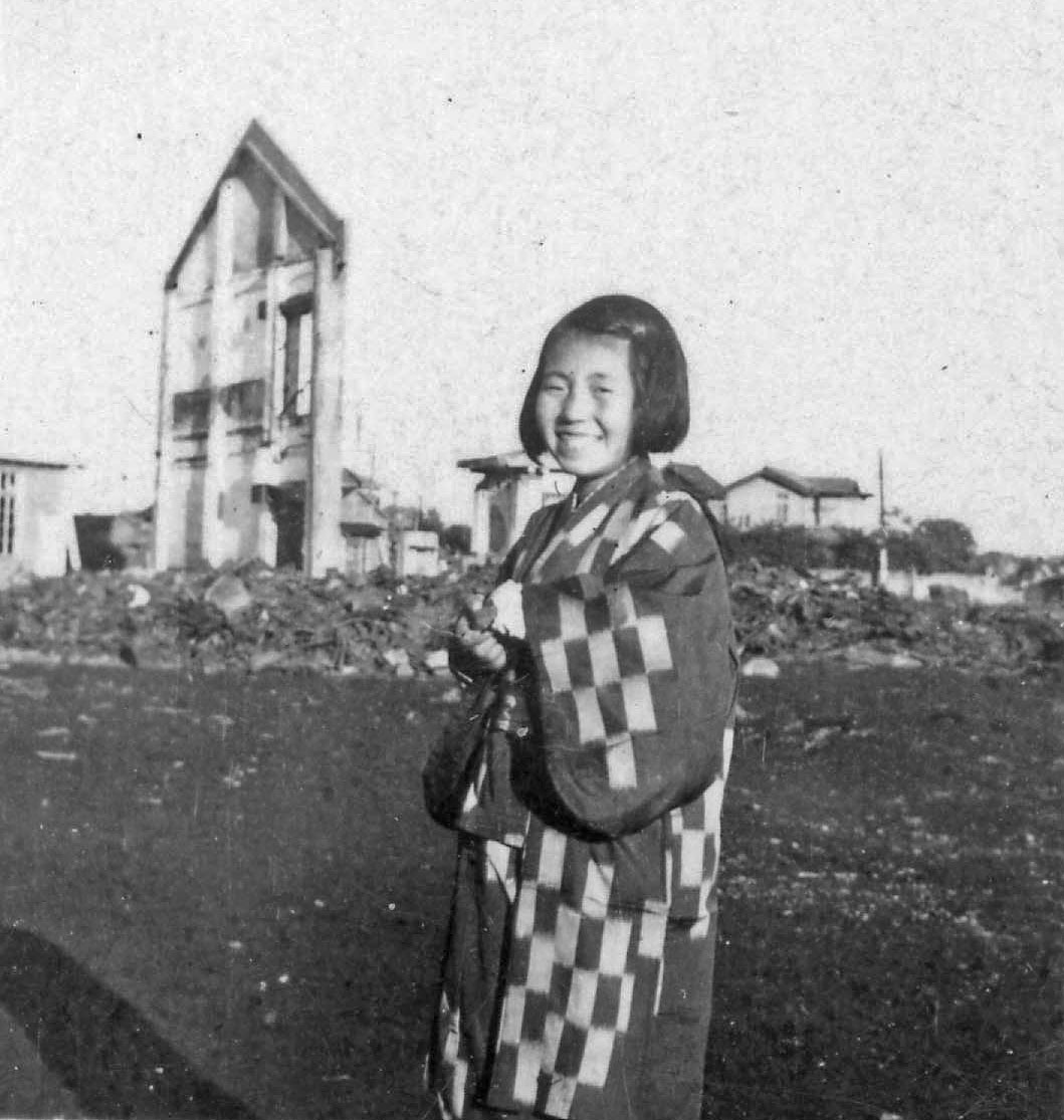 1947年1月 焼け跡に立つ姉 後の建物は向原小学校か |