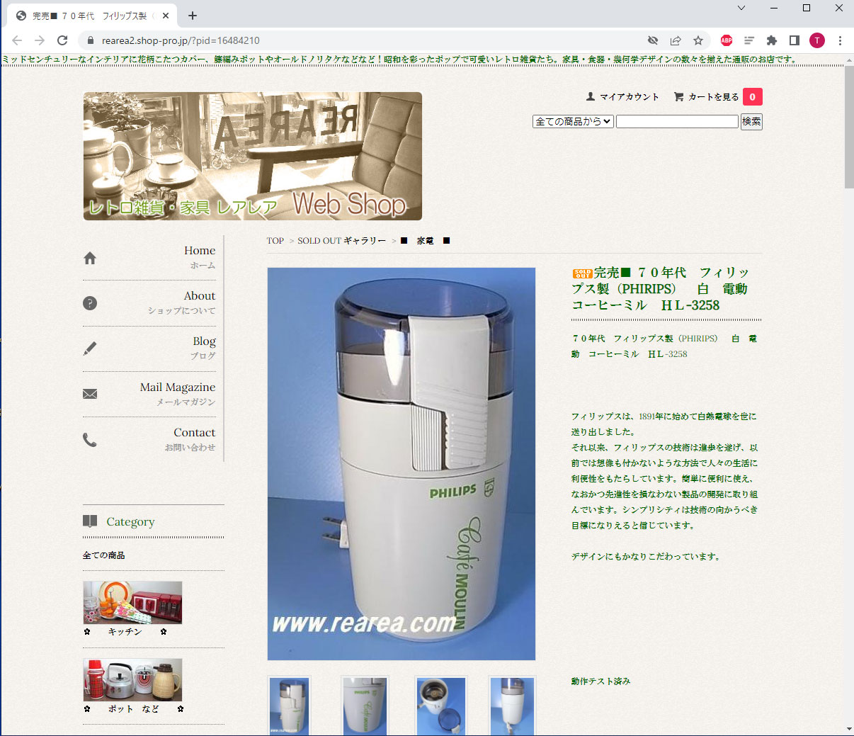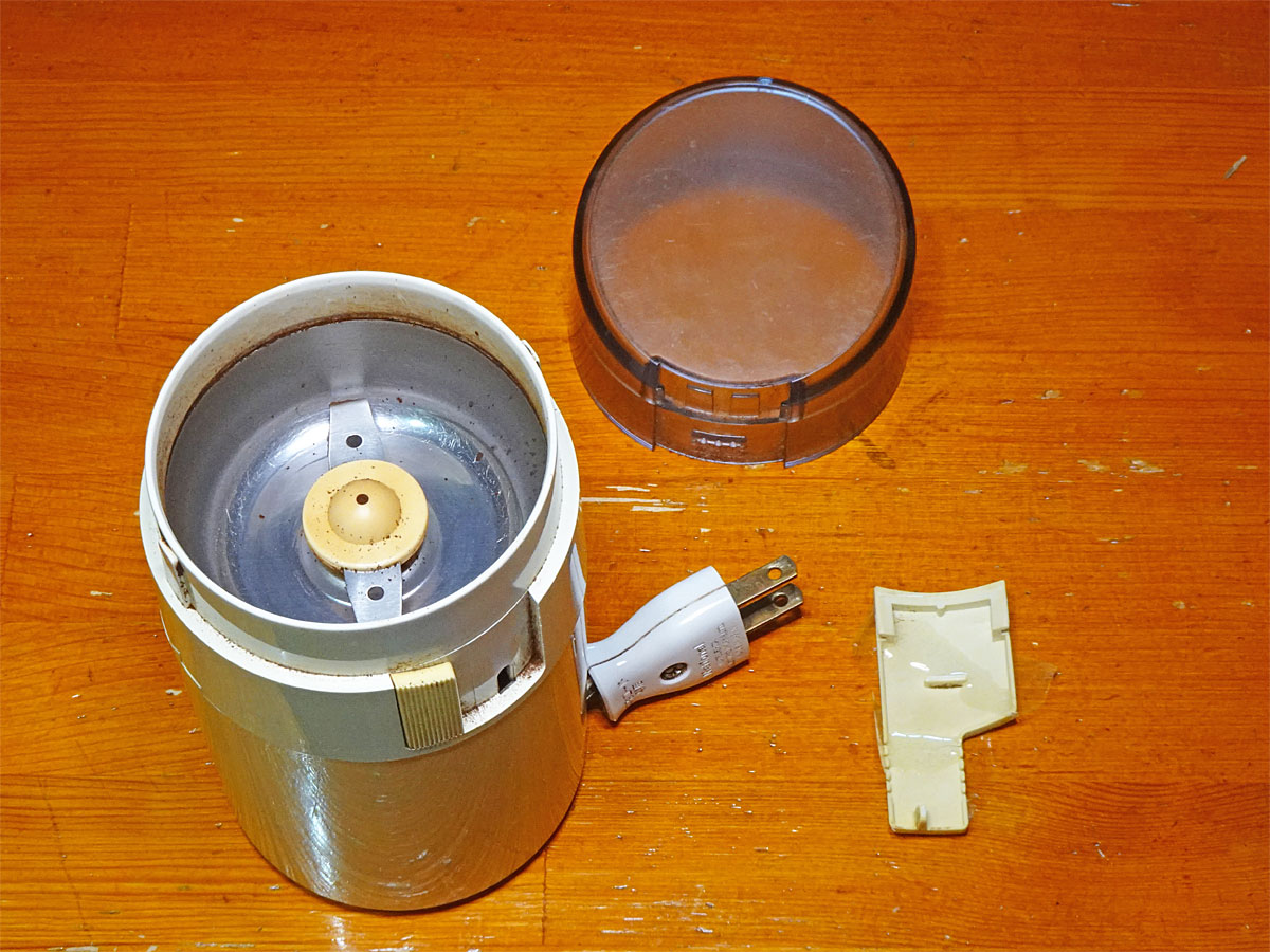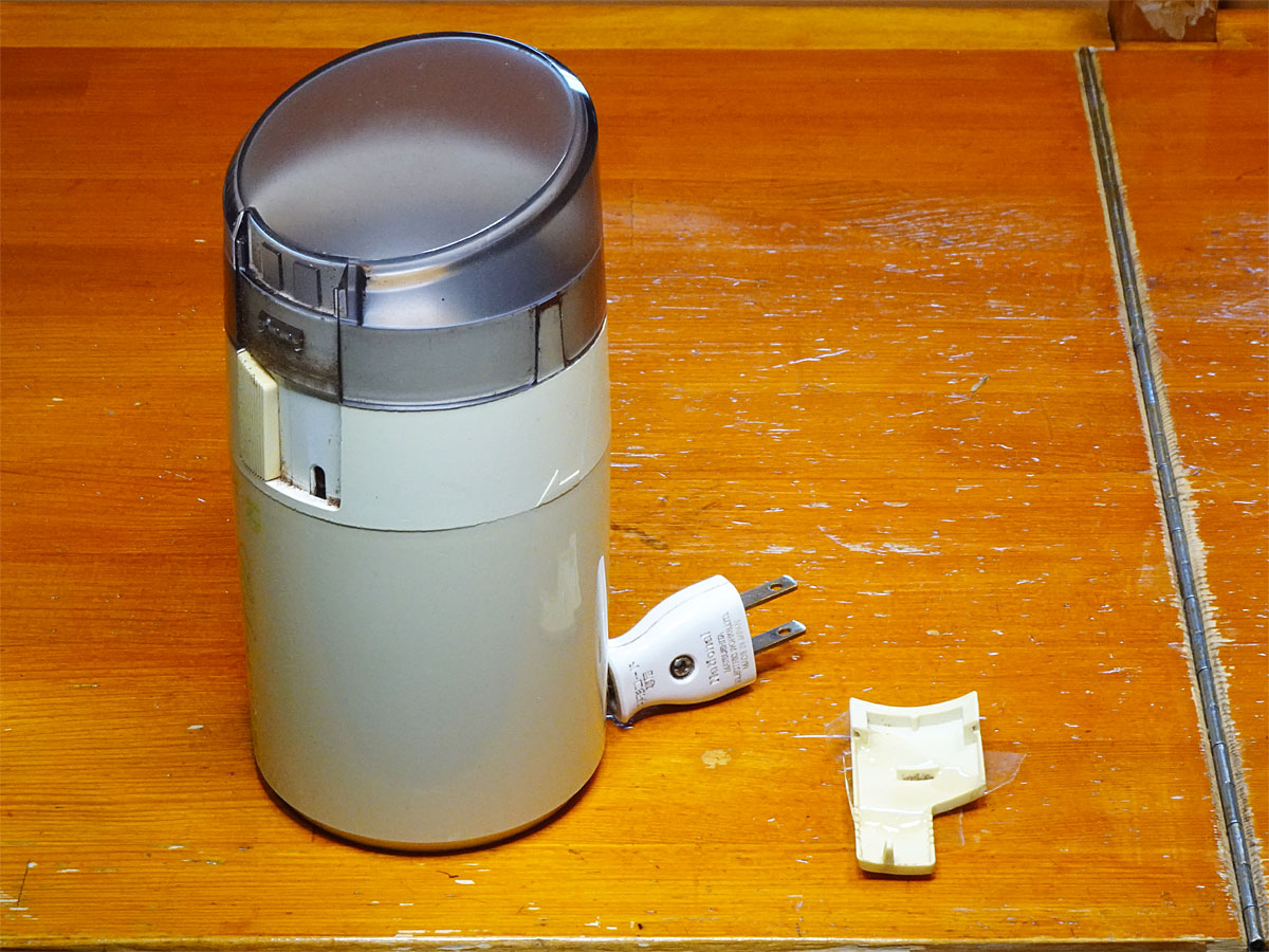 はもう40年以上も使い続け、その間にあちこちが壊れたがその都度修理してきたものである。 今回の破損を機会に新しいコーヒーミルに買い換えようかと思って現在市販されているいろいろな製品を調べてみたが、このモデルの特長であるコードの巻取りができる製品が見つからなかった。 この機構はとても気に入っているので仕方なく同じ製品をヤフオクで探したところ新品ではないが出品されていたので即決で落札した。 落札価格は現在市販の同様なコーヒーミルの新品の値段と同じ程度だが仕方がない。