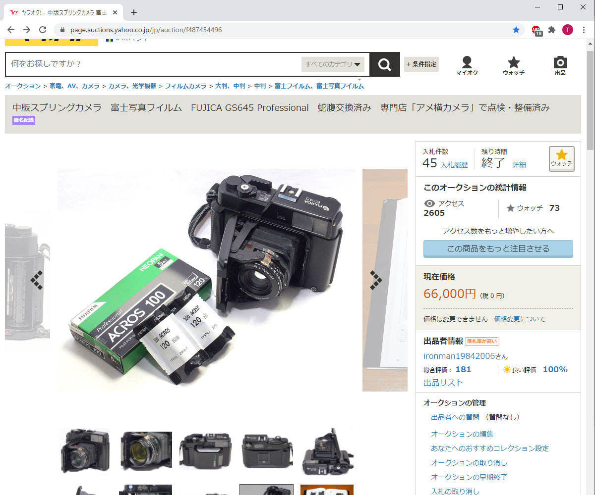 不要になったカメラの処分でヤフオクに出品していた古い中版のスプリングカメラ、富士写真フイルムの Fujica GS645 Professional が今夜落札された。 これもまた信じられないような高値で、なぜだろうと首をかしげるばかり。