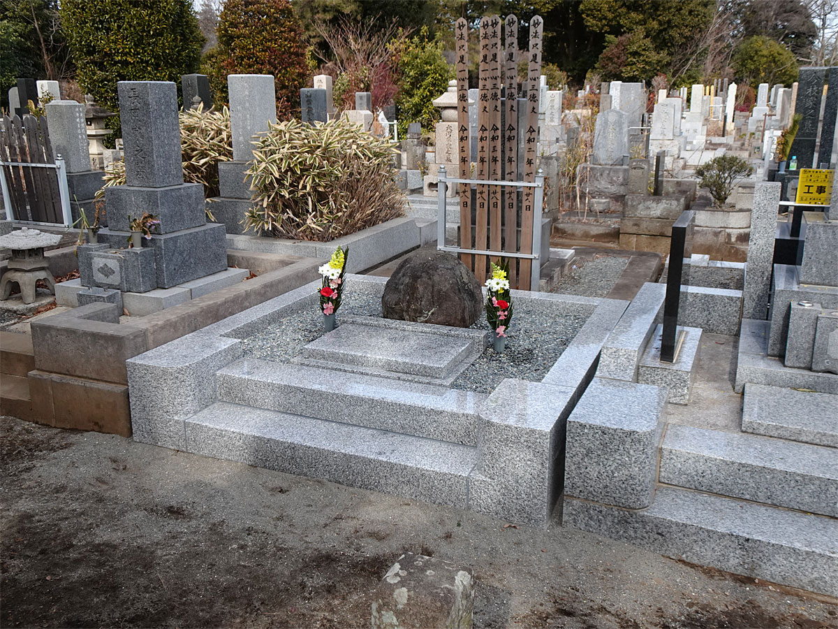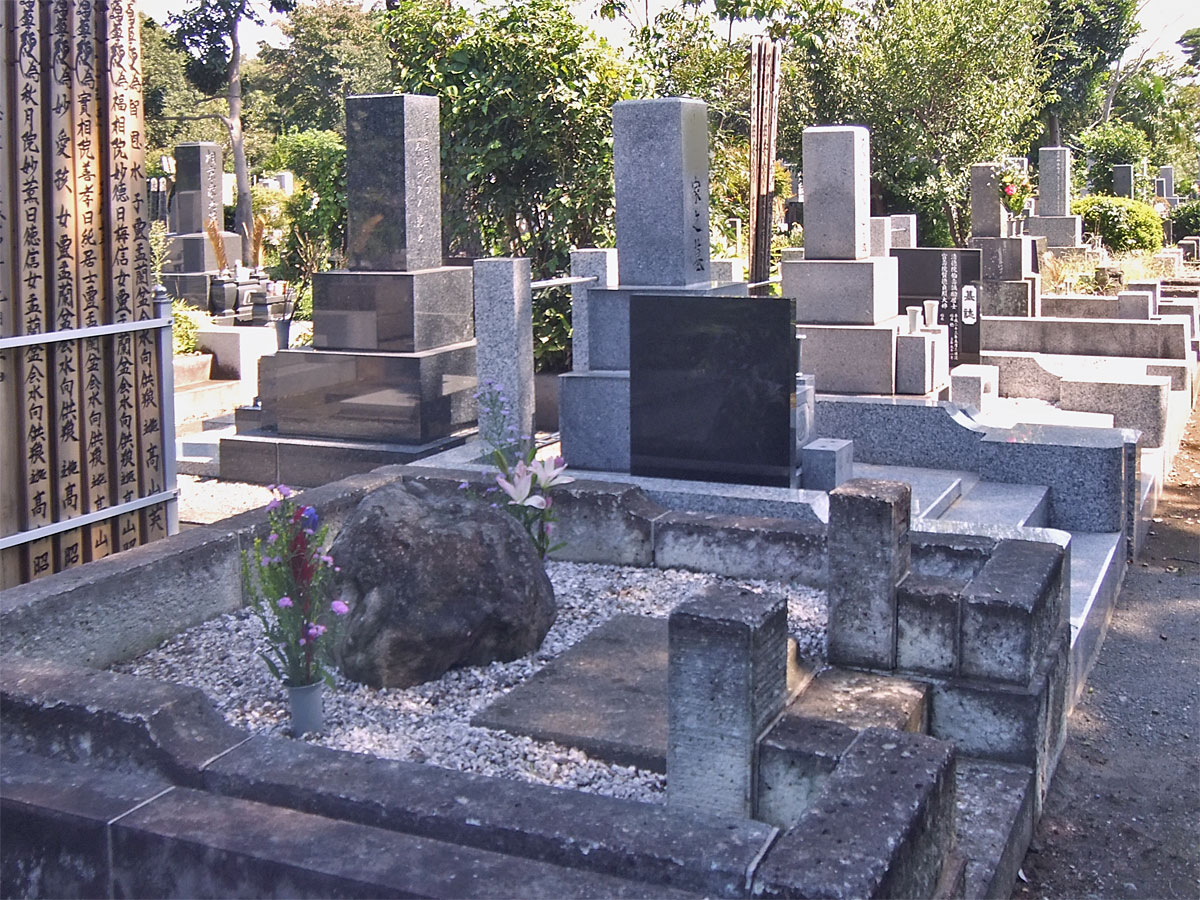 長兄を埋葬するために父が手に入れて(使用権)ずっと更地のまま使用料を払い続けて維持されていた。 1976年に父が死んだ時に母が墓柵を作り墓石を置いた。 その工事の時に掘り返すと地中に唐櫃(からうと)がありその中に骨壺が安置されているのを発見して皆驚いた。 父も母も宗教とか家督ということには全く縁がない(というより拒絶していたようだ)ので母は一般にあるような墓(仏式の家墓)ではなく自分の好みの自然石(庭石として販売されていたもの)を置いた。