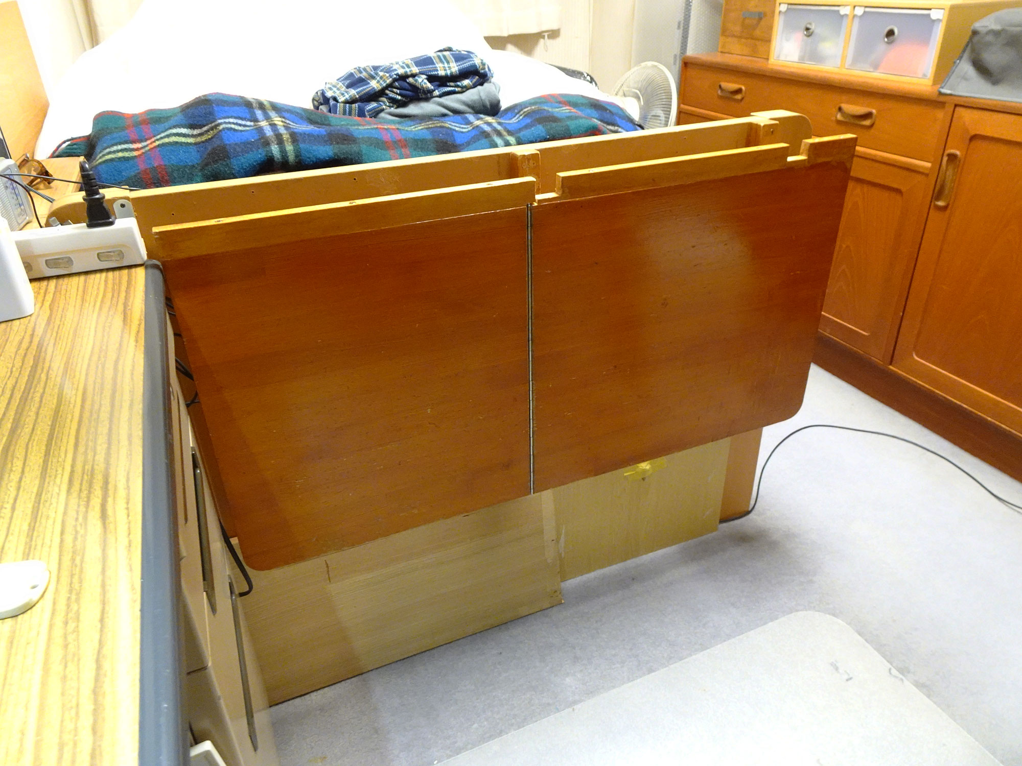 クラビノーバの上の黒い布はベッドカバー。 プリンターとクラビノーバには埃除けのカバ―をかけている。 ベッドのヘッドボードには折り畳みのテーブルを取り付けたが極めて便利で重宝している。 抽斗の中のものを取り出すときには、左側を跳ね上げる。