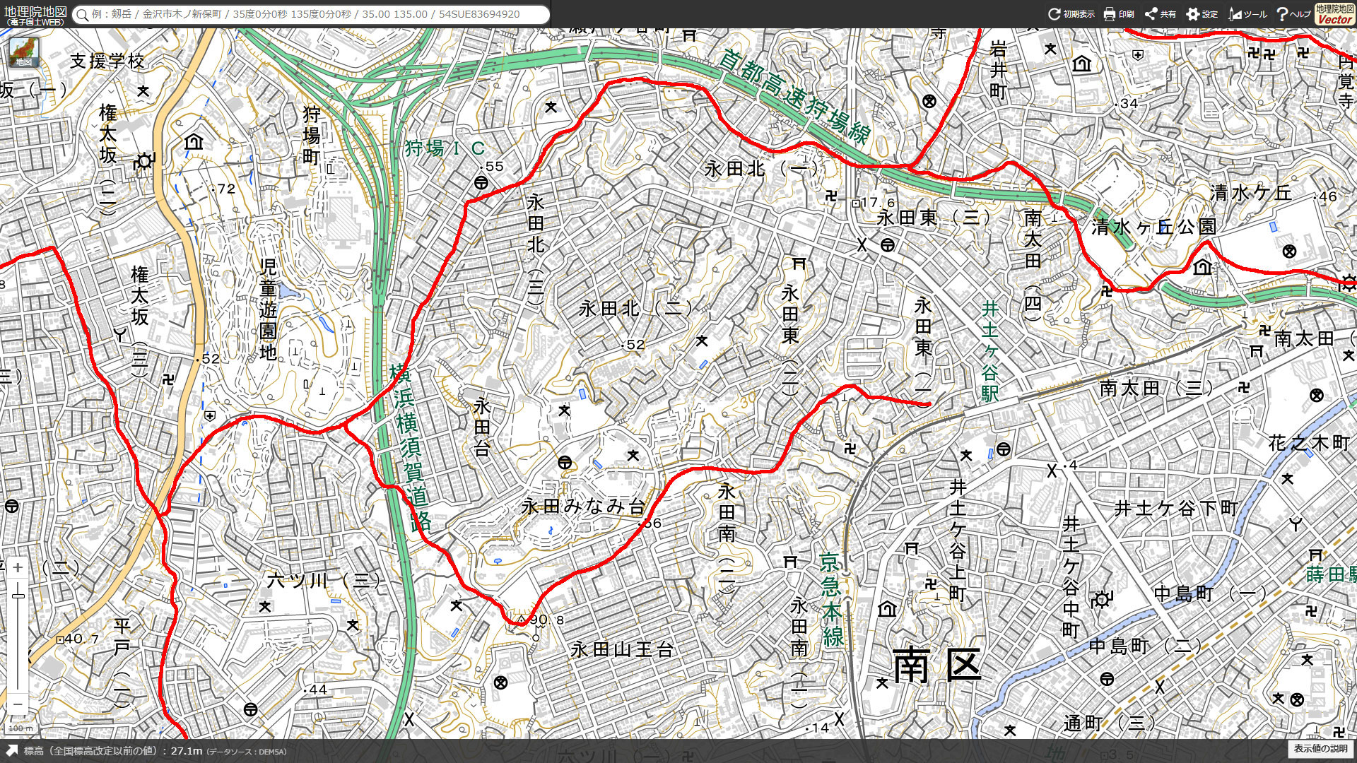 中央は永田川・大岡川水系