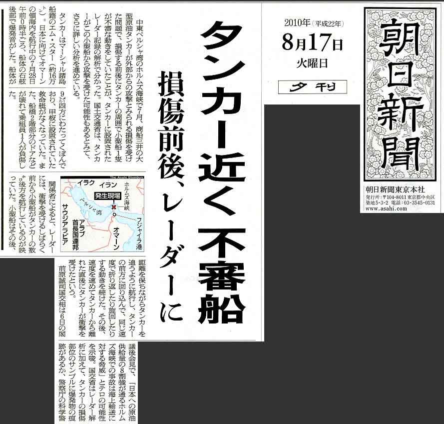 日朝刊の記事 「タンカー損傷 付着物 国も分析へ」へ