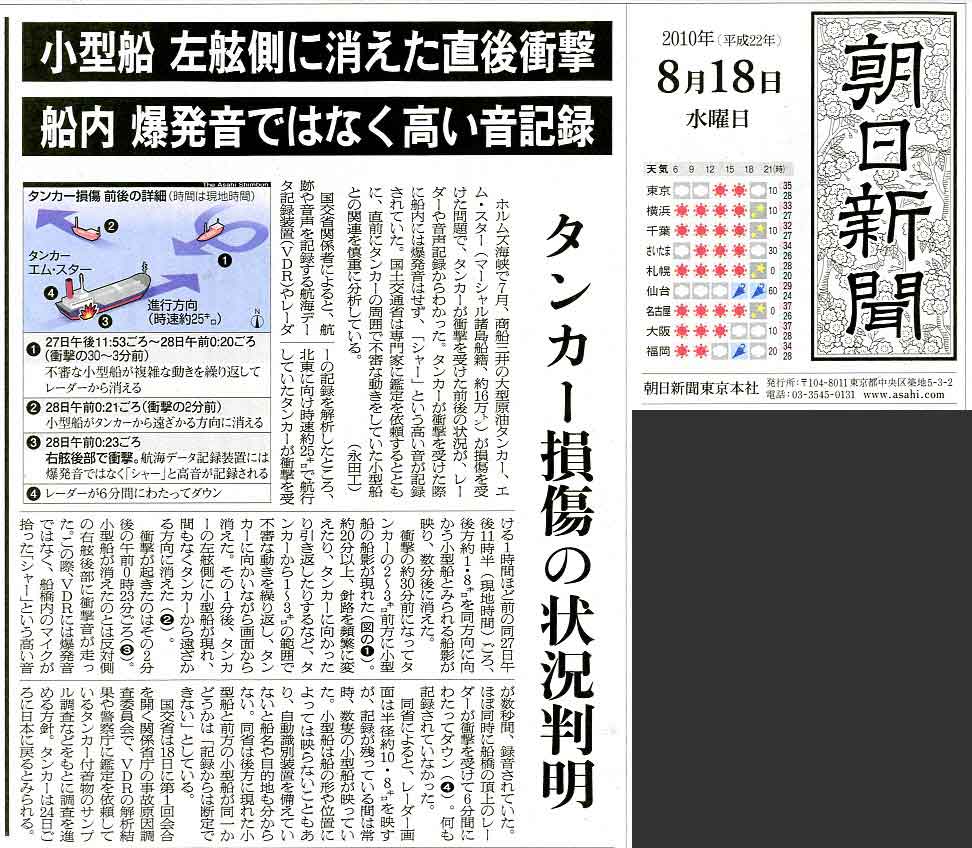 前日の夕刊の記事「タンカー近く 不審船」へ
