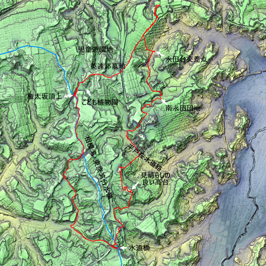 赤い線がウォーキング 青い線は相模湾と東京湾の分水嶺