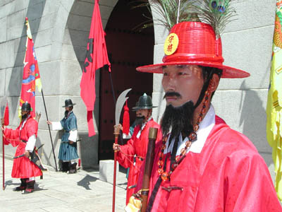 翌日は朝から徒歩で、もう一つの宮殿である、景福宮(キョンボックン)へ。 正門の前の大きな交差点にはどういうわけか横断歩道がなく遠回りして、次の交差点の地下道へ。丁度正門前の衛兵の交代式。衛兵役の若者の不動の表情にこちらが笑ってしまうのは、チェコのプラハ城と同じ。悪いけれど隣に並んで写真を撮る。この宮殿も大変美しく復元維持されて海外はもとより国内の観光客や修学旅行でにぎわっている。併設されている国立民族博物館では、古代から近代までの朝鮮民族の歴史を色々な資料によって分りやすく展示している。日本の占領下の朝鮮については日本からの数多くの観光客にも納得できるようにさらりと紹介しているが日本人としては心して見る。近代になって第二次世界大戦によって日本の占領統治から開放された後、外来のイデオロギーと都合によって不幸にも国土と民族が敵味方になって戦った朝鮮戦争、その結果国土と人々は南北に分断され、それぞれ大きく異なる体制となっている朝鮮の一つの民族の現代までの生活については、ここは民族の歴史の博物館であるのに、全く触れていないのが印象的である。暑い暑い真夏の太陽に宮殿の彩色が映え、宮殿内部の廊下や部屋には爽やかな風が通り抜けていた。 |