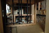 工房内部 見学者、製作中のオルガン全体、右隣に修理中のポジティフ(小型オルガン)が見える |