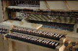 鍵盤とローラーボードと 上部のウィンドチェストは左側のカバーが外してあるので内部が見える |