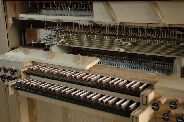 ストップのリンク機構 左奥上部に前面パイプ列用のトラッカー(弁引き棒)が見える |