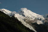シャモニー(フランス)のホテルの部屋からモンブラン峰(左端の丸く白い山)と氷河を望む |