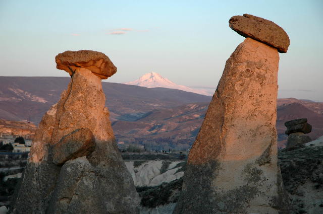 3月 トルコ共和国 カッパドキア地方 エセンテベの奇岩群 遠くにトルコ富士と呼ばれる雪を頂いた美しい山が見える |
