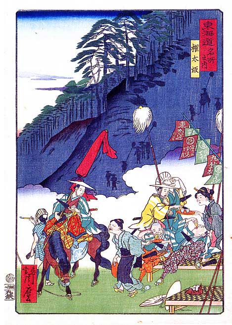 東海道名所之内 権太坂 背景に権太坂の急なのぼりを陰影で表現し、全面にはそれと対照的に明るくやや滑稽味を帯びた(境木立場の)茶屋の情景が描かれている。(企画展 東海道宿駅制度400記念「東海道と保土ヶ谷宿」横浜市歴史博物館 2001年10月27日発行のカタログから) よく見ると、茶屋の幟の中に、この浮世絵の版元の「丸鉄」の一枚がちゃっかりと描かれている。絵師が気を利かせたのか、版元が絵師に指示したのか。すでに旅行・出版・宣伝広告を総合プロデュースする「るるぶ」や「まっぷる」と同じ仕組みが江戸時代に完成していた。このシリーズの他の絵も見てみたい。 |
