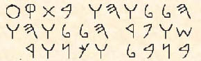 右から左へ上の段から下の段へ読んでください。 最初の鍬の形の字はラテン文字(ローマ文字、ローマ字、アルファベットの一種)ではHです。次のGか6みたいな字はLです。 Yのような字はVです。 だから、最初はHLLVHV となります。 「(神を)褒め称える」という意味です。 Alleluia は HLLVYH の音訳です。 これに似ていますね。