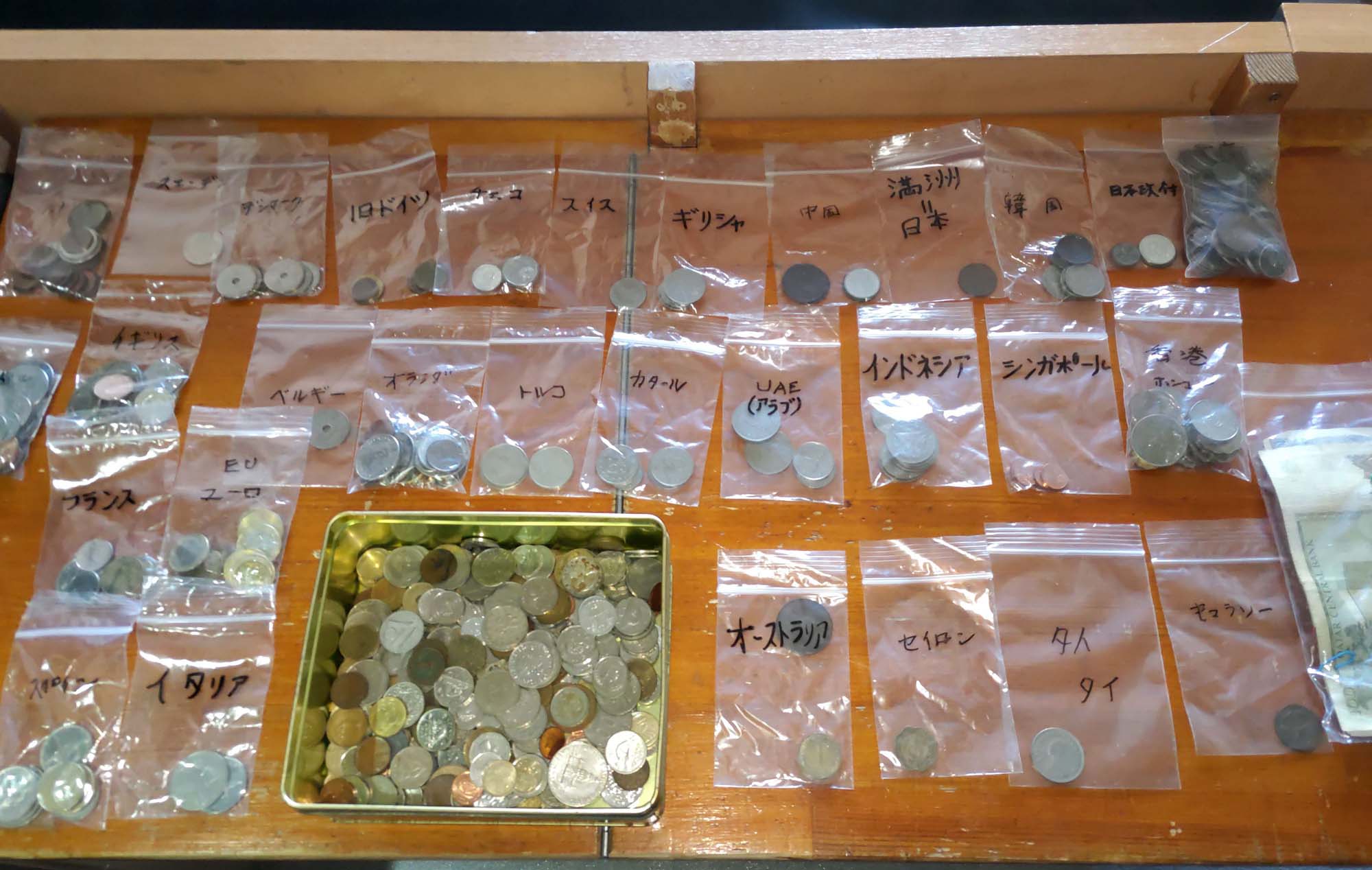 缶の底にまだ分別していない硬貨もバラでそのままになっていたので、一つづつ国を調べて分別した。